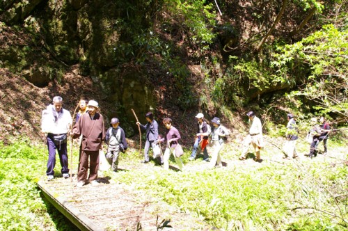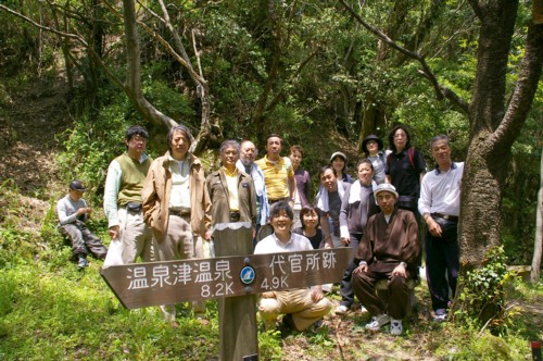 | もう少しユックリ景色を楽しむとか そう言うのは いないんだなあ? 集まったと思ったら弁当を配ってソレッて歩き始めて! しかも次の角には休憩用のベンチとかあるのに・・・ 必ず一個手前で休憩する? 景色が良いトコで止まろうとしたら先で高田さんが手を振っているから何かなあ? って 行ってみたら 「飯、食い終わった!」だもんなあ! 後ろはまだ到着してないのに!! 峠には茶屋の跡とかって遺跡もあったそうなんですが? 全員が食べ終わったらもう駆けるように下り始める? 下りきって電話しようとしたら・・・電波が届かない!! 地区の公民館みたいな所まで歩いて 迎えを待つ! 温泉津組と毘沙門組に分かれて温泉へ 温泉津では薬師湯の屋上でコーヒーをご馳走に? |
